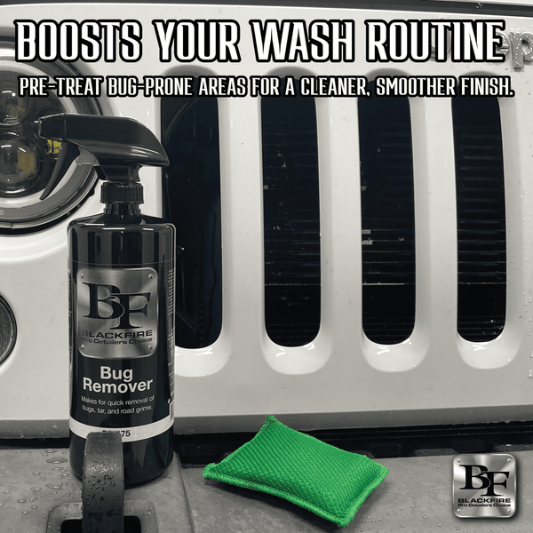 BLACKFIRE Bug Remover is a gentle cleaning formula that will safely and effectively remove insect remains from your vehicle's paint, glass, plastic, vinyl, and aluminum surfaces. BLACKFIRE Bug Remover is concentrated to double your cleaning power with just one spray and can be tailored to meet your specific needs. Use BLACKFIRE Bug Remover as a spot treatment immediately after contact, or as a pre-treatment to make your washes even more effective!