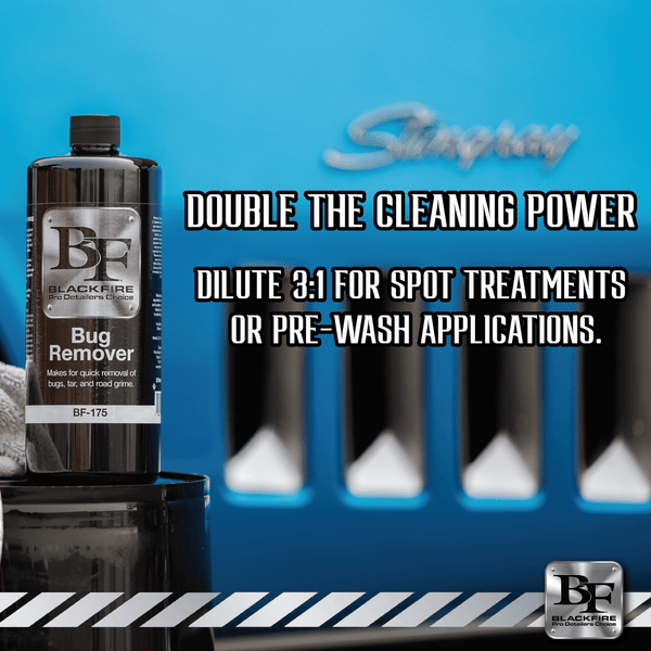 For use as a spot treatment: Dilute BLACKFIRE Bug Remover 3:1 and spray the affected area directly. Allow to dwell on the surface for approximately 30 seconds (do not allow to dry on surface) and wipe away using a clean microfiber towel or strong jet of water.