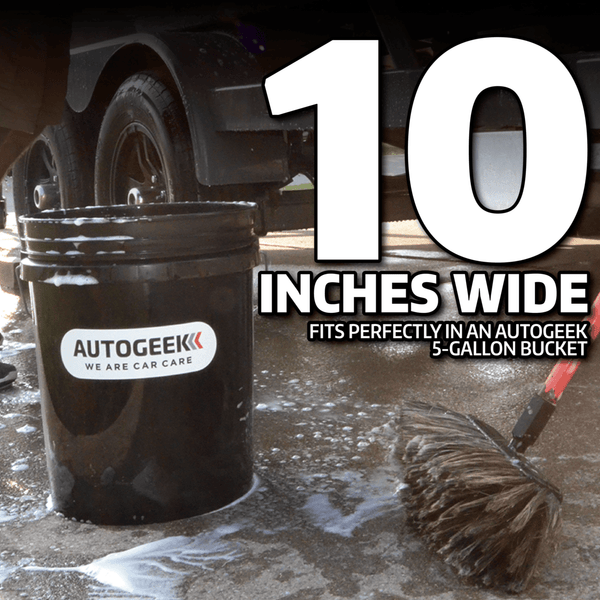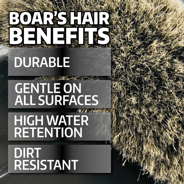 The Montana Original Boar's Hair Brush PLUS features four hundred hairs per bundle. Boar's hair is naturally fathered at the ends, but our bristles are flagged (split) one more time before being affixed to the heavy-duty plastic handle. The tight bundles of hair ensure that the bristles remain sturdy as they gently whisk away dirt and grime from your vehicle. Boar's hair is surprisingly soft, and its durability is unmatched by any other natural hair. It's been used to make hair brushes for people for years. Unlike synthetic bristles that can rub your vehicle the wrong way, boar's hair stays soft. It lightly massages the surface of the paint and, amazingly, it doesn't fall limp when wet. No nylon or polyester fibers are used in this brush - its 100% boar's hair! Each of the dense bundles of hair is permanently secured to a 10" molded plastic block. The block is curved to increase the contact area between the bristles and your vehicle. Washing large vehicles has never been easier! Boar's hair naturally holds more soapy water than synthetic materials and the bristles do not retain dirt like sponges or mitts can. Use the Montana Original Boar's Hair Brush PLUS to gently wash large vehicles - like vans, big trucks, and SUVs - as well as boats and RVs. The soft, natural bristles will not scratch clear coats, gel coats, fiberglass, plastic, or any other surface. The Montana Original Boar's Hair Brush PLUS is 10 inches wide. It fits perfectly in the Autogeek Complete Wash System bucket or any standard 5-gallon bucket. Give your vehicle a luxurious wash with the Montana Original Boar's Hair Wash Brush PLUS. Its fanned shape gives it excellent access and maneuverability as it glides over your vehicle's delicate surfaces.
