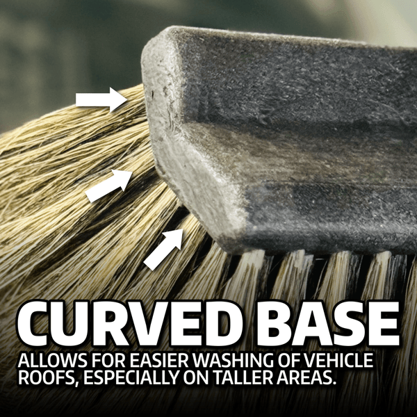 The Montana Original Boars Hair Brush PLUS And Telescopic Handle features a curved, fan-shaped design that makes it easier and safer to wash large vehicles like trucks, SUVs, and RVs. Its 100% natural boar's hair bristles are ultra-soft, durable, and hold more soapy water without scratching surfaces or retaining dirt. The angled design improves comfort and prevents the brush base from touching the paint. At 10 inches wide, it fits standard wash buckets and offers a gentle, effective clean for delicate finishes.