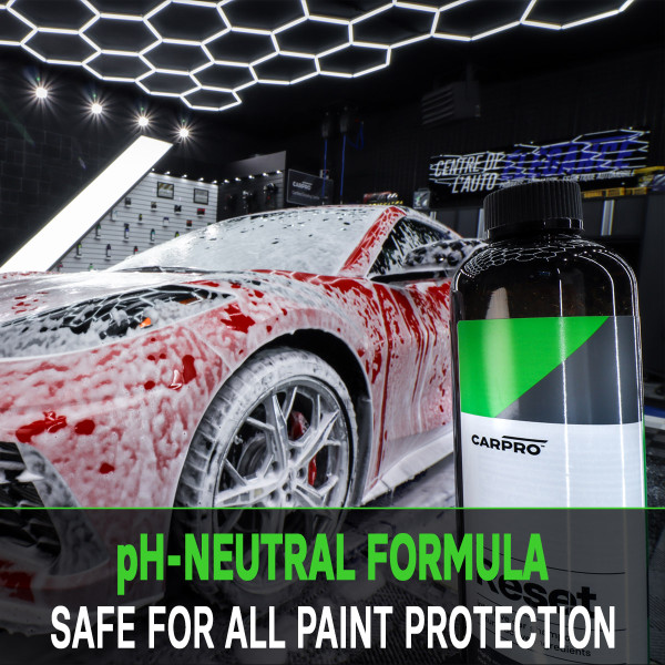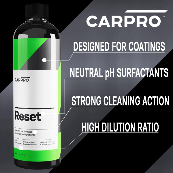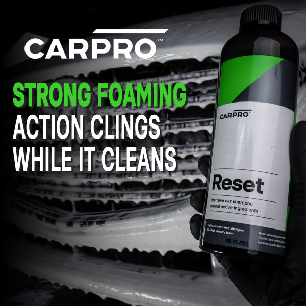 CARPRO Reset Intensive Car Shampoo is formulated with intelligent pH surfactants that give Reset the cleaning ability of a alkaline-based detergent, without compromising the water beading or protection of the underlying coating. CARPRO Reset Intensive Car Shampoo will not alter the water beading or sheeting characteristics of the underlying coating.