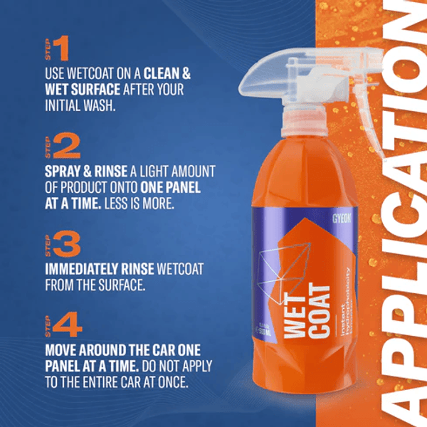 GYEON WetCoat is unique in that it is safe to use on almost every exterior surface of your vehicle. Use it on paintwork, plastic, metal trim, rims, and even glass! A few quick sprays followed by a rinse are all it takes to create a super shiny, hydrophobic surface on your vehicle!