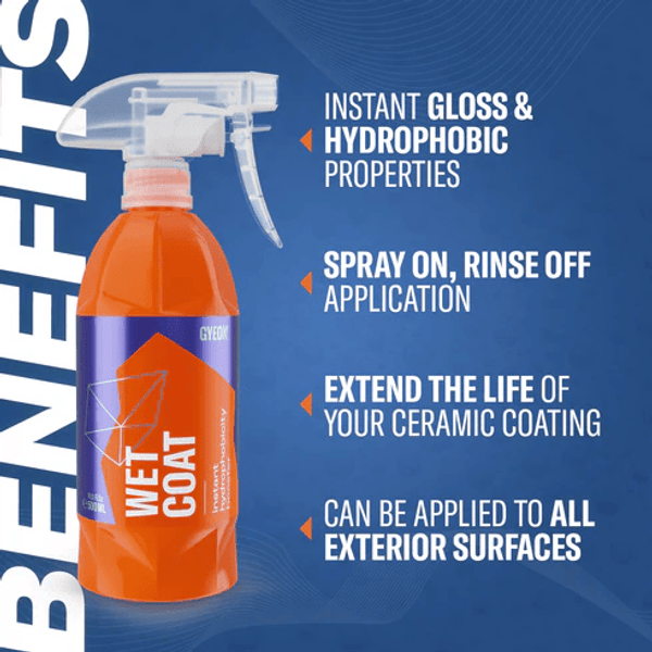 GYEON WetCoat is a unique spray sealant that applies easily and leaves your vehicle with a hydrophobic layer of protection. This revolutionary formula takes only minutes to apply and leaves paint shiny and able to repel dirt and water for up to 12 weeks. GYEON WetCoat is perfect for increasing gloss and longevity on vehicles previously treated with an SiO2 coating, and for those without a coating at all, the self-cleaning effect will reduce the number of routine washes necessary!