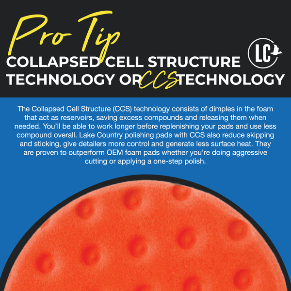 Use innovative Lake Country CCS pads for better polishing and waxing with less waste. The Collapsed Cell Structure (CCS) technology consists of dimples in the foam that act as reservoirs, saving excess compounds and releasing them when needed. You’ll be able to work longer before replenishing your pads and use less compound overall. Lake Country polishing pads with CCS also reduce skipping and sticking, give detailers more control and generate less surface heat. They are proven to outperform OEM foam pads whether you’re doing aggressive cutting or applying a one-step polish.