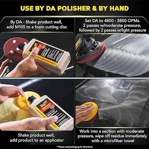 Meguiar's Mirror Glaze #105 Ultra-Cut Compound is a ultra fast-cutting compound for rapid paint correction with minimal compounding swirls. Super-micro abrasives leave a "best in class" finish that requires very little finishing work. Remove your vehicle's worst imperfections quickly with professional grade Meguiar's Mirror Glaze 105 Ultra-Cut Compound. DA Approved Version.