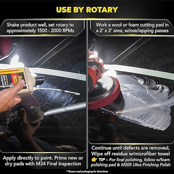 Meguiar's Mirror Glaze 105 Ultra-Cut Compound should be applied with a polisher if you plan to compound the entire vehicle. Work at a maximum speed of 1500 to 2000 RPM with a foam or wool cutting pad. Work until the compound starts to dry. Wipe off the residue with a clean Cobra Microfiber Towel. If necessary, follow up with Meguiar's Mirror Glaze #205 Ultra Finishing Polish to completely restore the gloss.