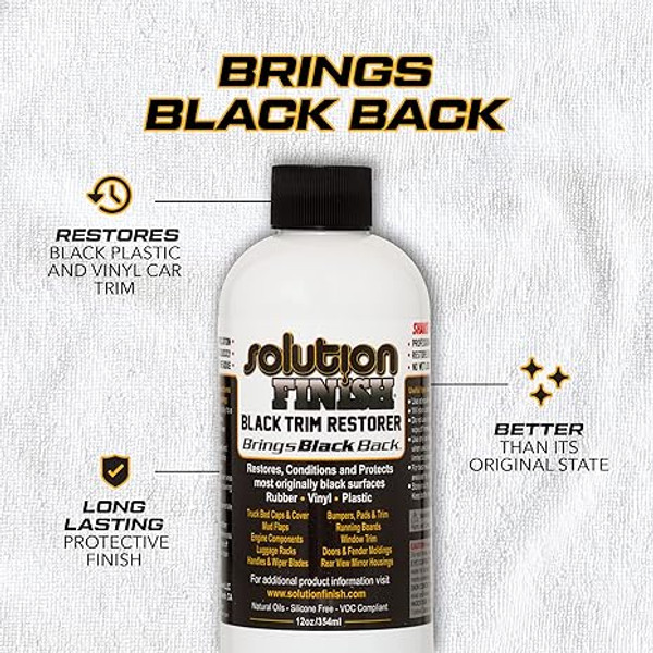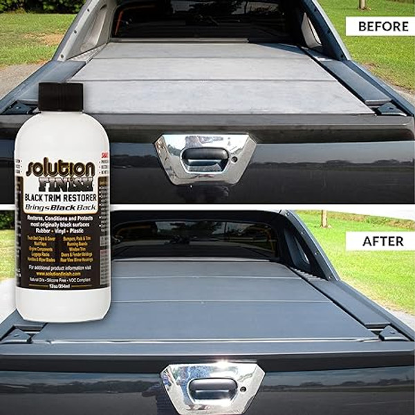 Q: How much trim can the 12oz bottle cover? A: A 12oz bottle of Solution Finish is a very generous size. It can easily cover multiple vehicles, or a full-size truck's trim, bed rails, and bumpers with product to spare. A little goes a very long way.