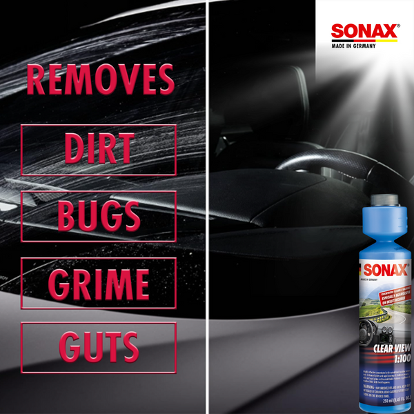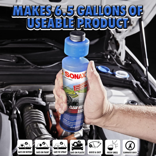 SONAX Clear View Concentrate is an advanced, highly concentrated formula designed to clean your windshield of all contaminants quickly. SONAX Clear View Concentrate will produce a whopping 6 gallons per 250 ml bottle and will remove most vision impairing road debris such as insects, oil, road grime, and other dangerous films without streaking. Don't wait for your next oil change to have a clear windshield!
