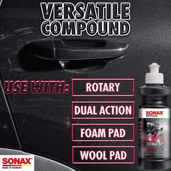 SONAX CutMax Cutting Compound can be applied with a rotary or dual action polisher. Depending on the level of cut you desire, use with a foam or wool pad. Regardless of the pad you choose, SONAX CutMax will impress you with its long buffing cycle and easy wipe off.