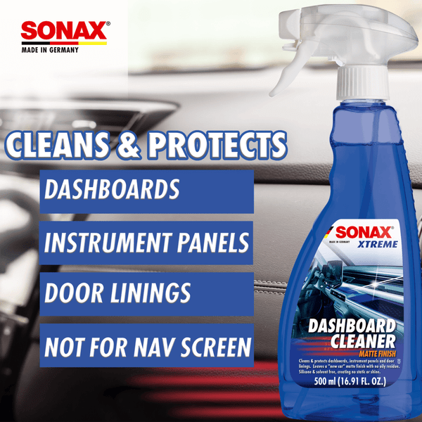 SONAX Dashboard Cleaner is the universal cleaner and protectant for the inside of your vehicle. The easy spray-on emulsion formula gently and effectively cleans textured and soft matte finishes such as the dashboard and other synthetic interiors. SONAX Dashboard Cleaner leaves a low-glare, anti-static finish that complements any vehicle.