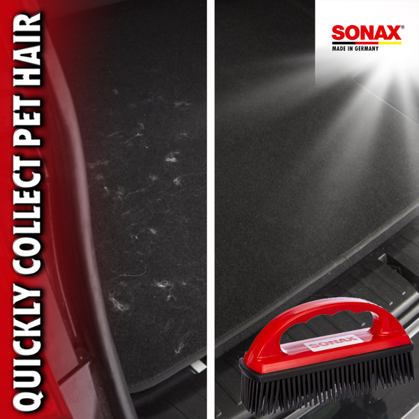 The SONAX Pet Hair Brush is an expertly developed brush that is designed for the quick and easy removal of all types of pet fur. The SONAX Pet Hair Brush has rubber bristles which attract pet hair like a magnet, pulling it out of your carpet or upholstery effortlessly! All the while, these rubber bristles are soft enough to be used on any surface of your interior without causing any harm. The SONAX Pet Hair Brush's ergonomic handle ensures that even people who own the most shedding prone pets won't get fatigued from extended use!