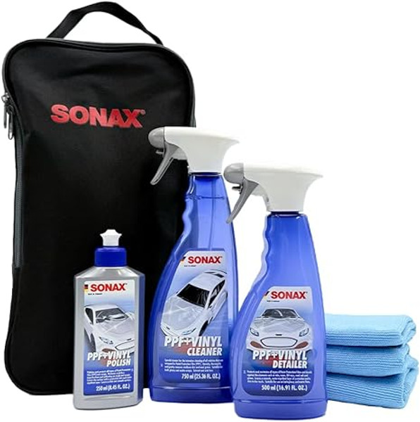 The SONAX PPF & Vinyl Combo Kit is a complete care solution designed specifically for Paint Protection Film (PPF) and vinyl-wrapped surfaces. This premium kit effectively removes contaminants, road grime, and dirt while enhancing gloss and providing long-lasting protection. With a combination of high-quality cleaning and detailing products, this kit ensures your vehicle’s protective films and wraps maintain their pristine appearance and durability. What's Included: SONAX PPF + Vinyl Cleaner – Gently lifts dirt, dust, and surface contaminants without causing damage to PPF or vinyl wraps. SONAX PPF + Vinyl Detailer – Enhances shine and adds a protective layer to repel dirt and water, preserving the surface’s clarity and gloss. SONAX PPF + Vinyl Polish – Restores and refines PPF and vinyl surfaces, eliminating minor imperfections while boosting shine. (3) Speed Master Premium Pearl Towels (16x16, Blue) – Soft, high-quality microfiber towels designed for safe and streak-free application. SONAX Black Bag – A convenient and durable storage bag to keep all your detailing essentials organized.