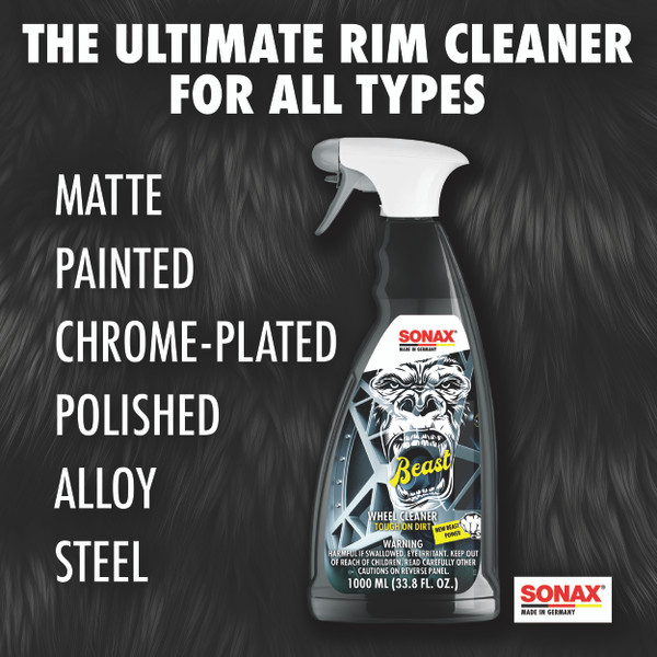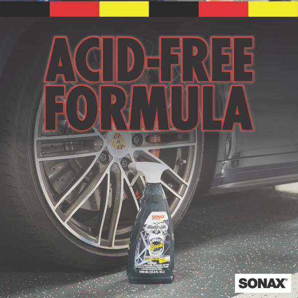 SONAX "The Beast" Wheel Cleaner is acid free and safe for the user and your surfaces. Plus, it doesn't utilize harsh detergents in its formulation. SONAX Wheel Cleaner Plus Use this wheel cleaner on all steel and light-alloy wheel rims, as well as, painted, chrome, metal plated, polished and matte rims. SONAX "The Beast" Wheel Cleaner does not attack the rim surfaces or wheel bolts and is suitable for tires with TPMS (tire pressure monitoring systems).