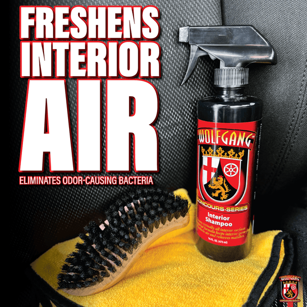 The most important factor of Wolfgang Interior Shampoo is that is contains a powerful antibacterial formula that keeps your interior germ free. Today, germs and viruses spread fast and it's important to keep all our surfaces clean and sterile. We practically spend as much time inside our car as we do anywhere else, so it's important that we keep it just as clean. Wolfgang Interior Shampoo has an improved polymer formula that creates nano-scale surfaces that organisms cannot attach themselves to, protecting you from the threat of germs. Wolfgang Interior Shampoo also freshens the air by removing the odor causing bacteria.