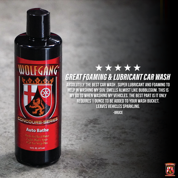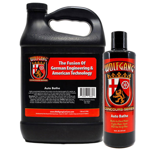 Wolfgang Car Care Auto Bathe Shampoo is a rich, high sudsing car shampoo that pampers even the most delicate paint finishes. This high lubricity car wash lathers your vehicle in paint-protecting foam as it loosens and lifts dirt and grime. Wolfgang Auto Bathe leaves your vehicle looking clean, shiny, and virtually water spot-free.