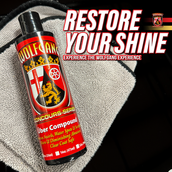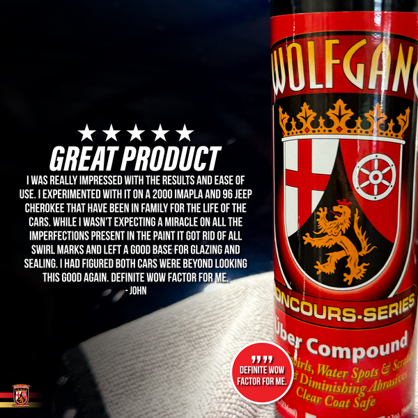 Wolfgang Uber Compound is a heavy-cut compound that is designed to restore the gloss and color to all paint systems without creating unsightly swirls or compounding haze. Formulated using an advanced blend of micro and diminishing abrasives, Wolfgang Uber Compound effortlessly removes heavy swirl marks, oxidation, water spots, and etchings from bird droppings without dulling the finish or creating new swirl marks. You control the aggressiveness of the compound by your pad selection.